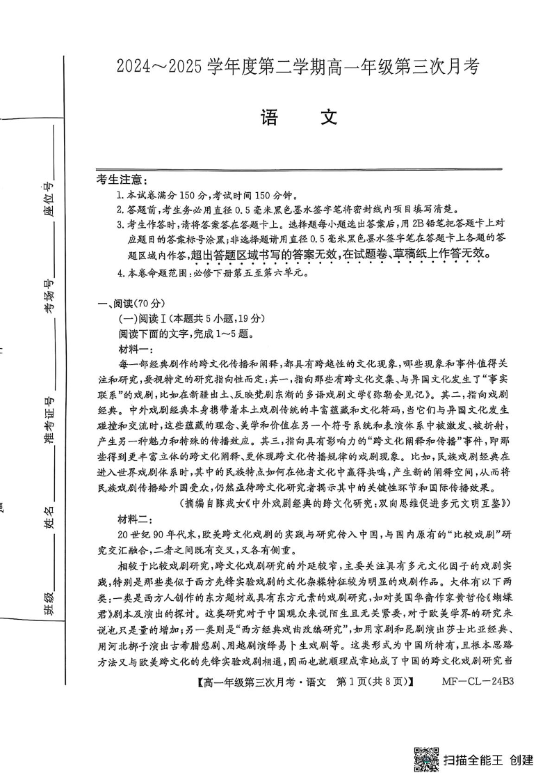 河北省沧州市四县联考2024-2025学年高一下学期6月月考语文