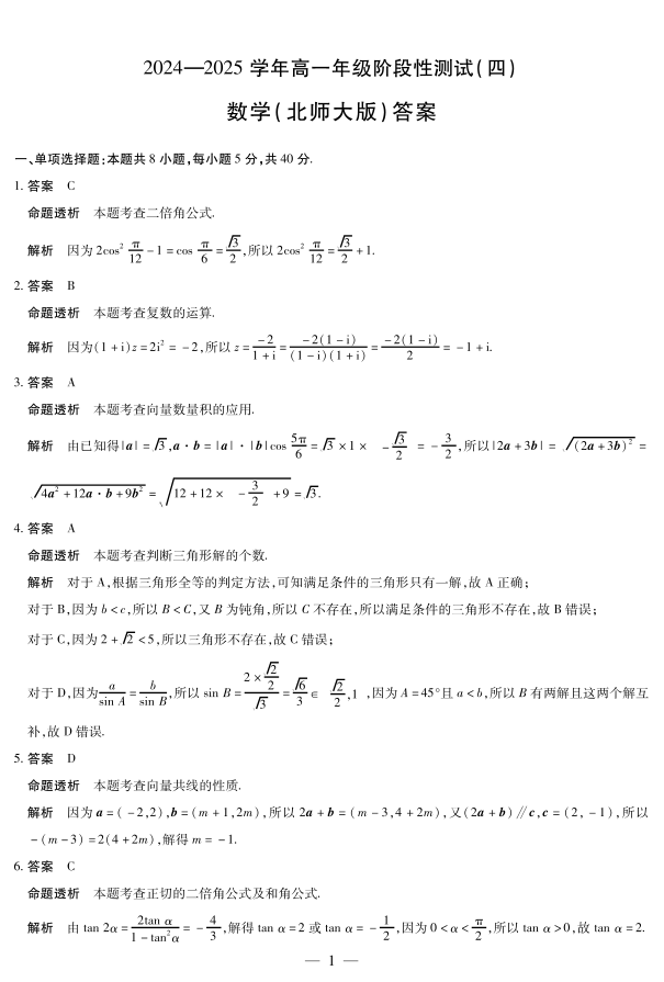 河南省部分学校2024-2025学年高一下学期阶段性测试(四)数学北师大版答案