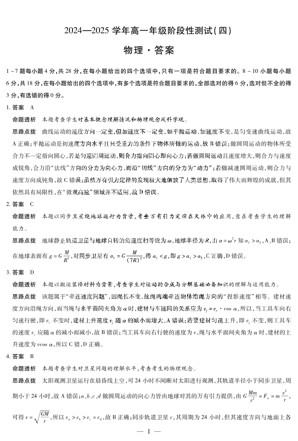 河南省部分学校2024-2025学年高一下学期阶段性测试(四)物理答案