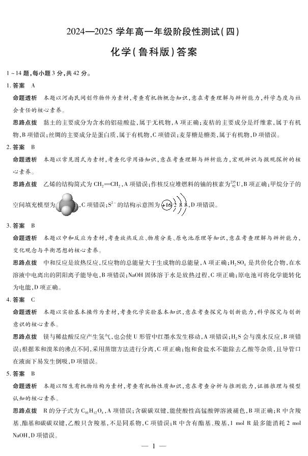 河南省部分学校2024-2025学年高一下学期阶段性测试(四)化学答案