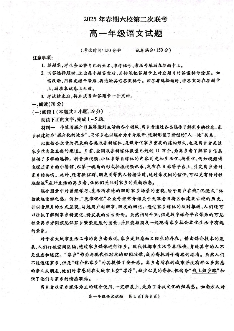 河南省南阳市六校2024-2025学年高一下学期第二次联考试题语文+答案