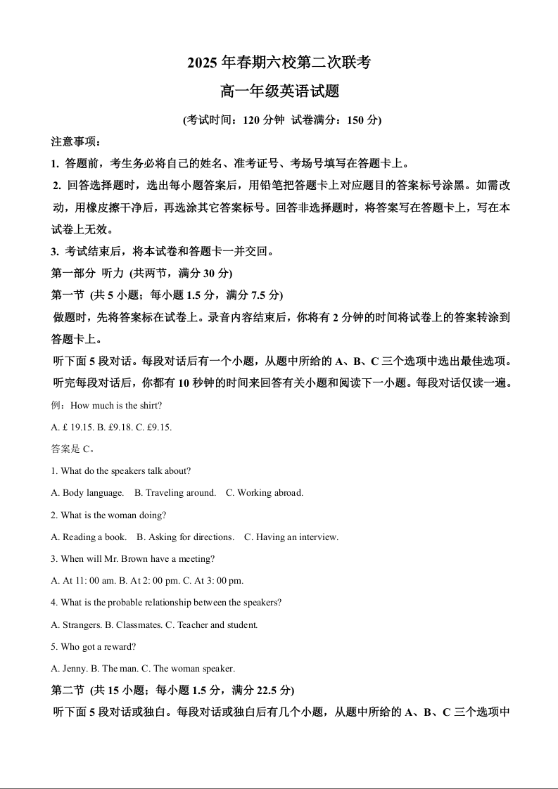 河南省南阳市六校2024-2025学年高一下学期第二次联考试题英语+答案