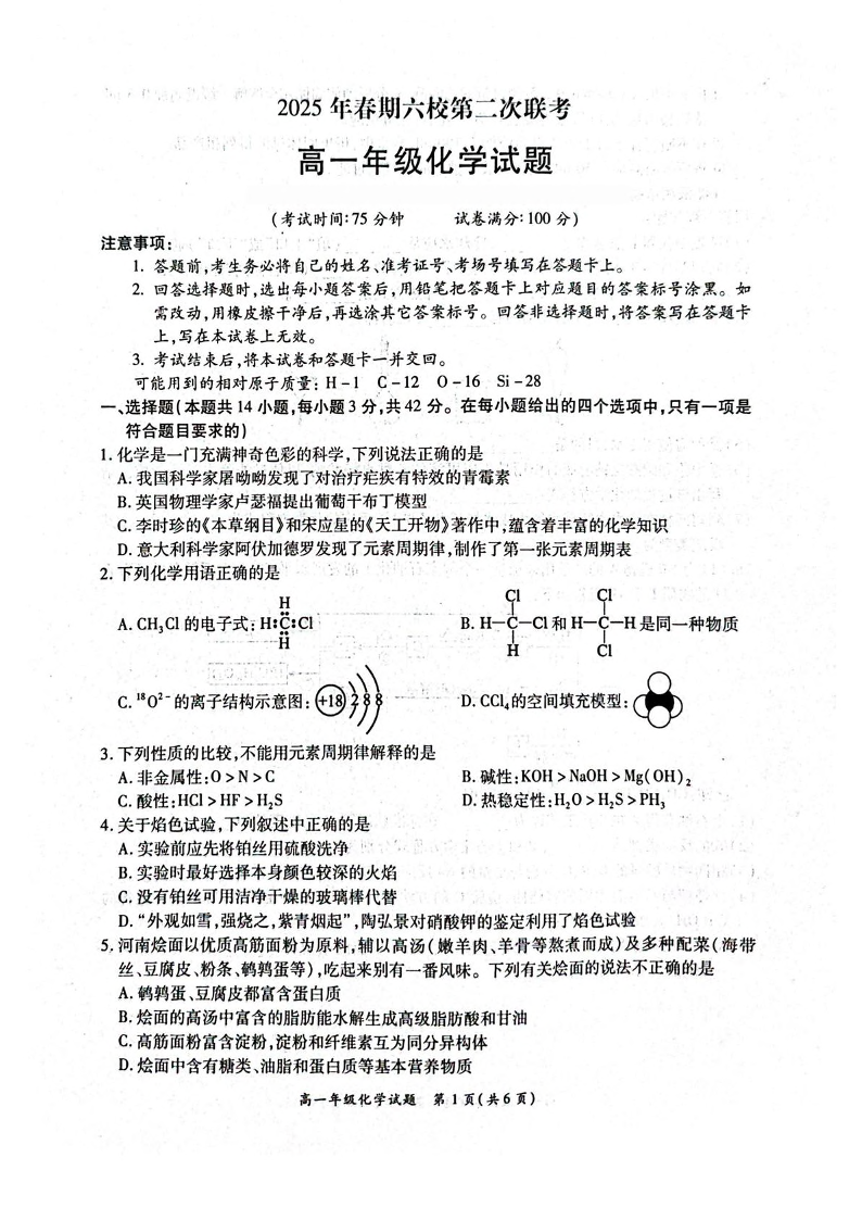 河南省南阳市六校2024-2025学年高一下学期第二次联考试题化学+答案