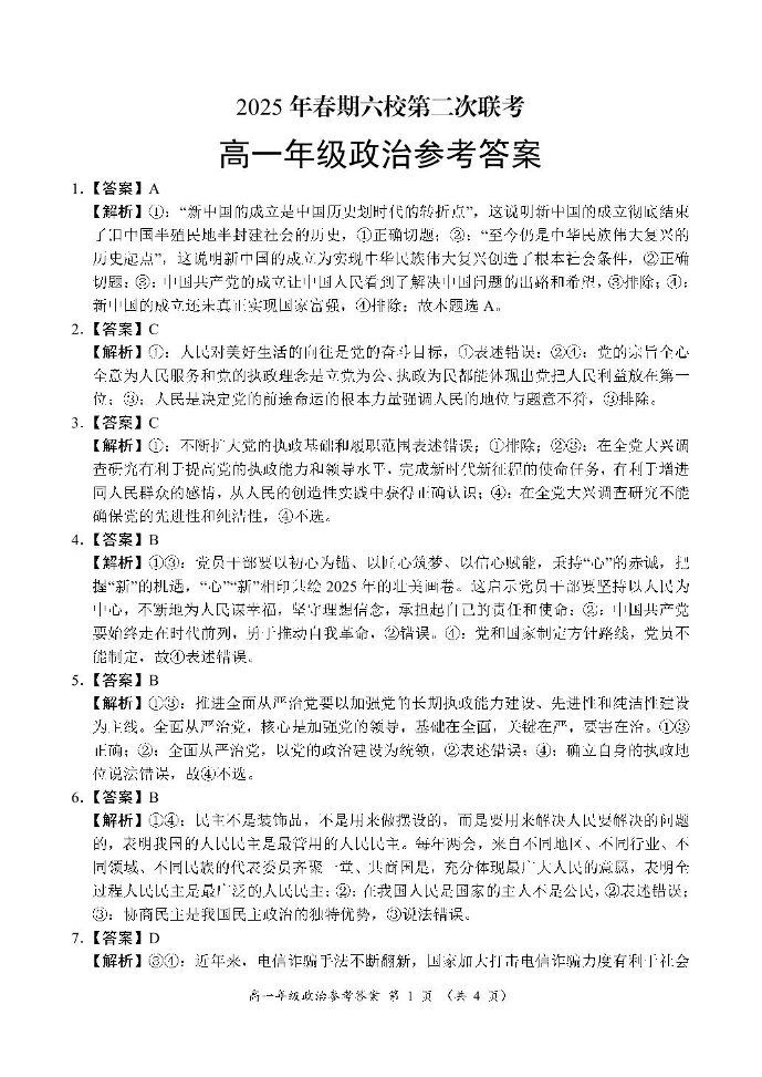 河南省南阳市六校2024-2025学年高一下学期第二次联考试题政治答案