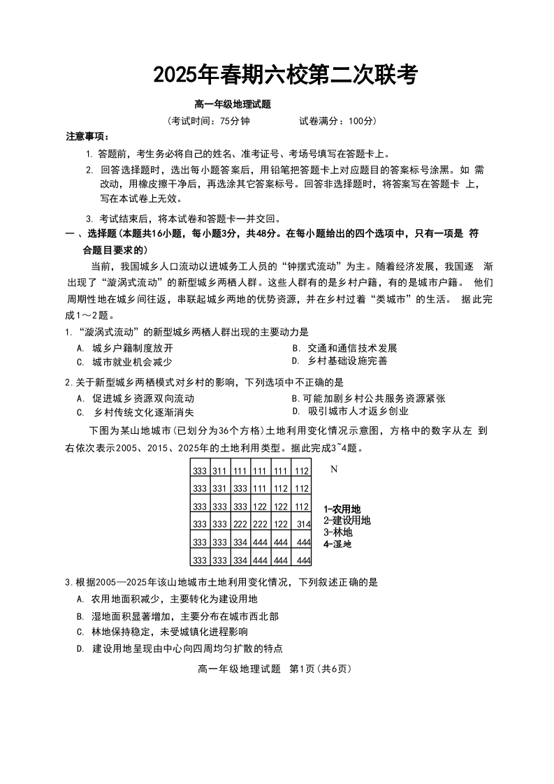 河南省南阳市六校2024-2025学年高一下学期第二次联考试题地理+答案