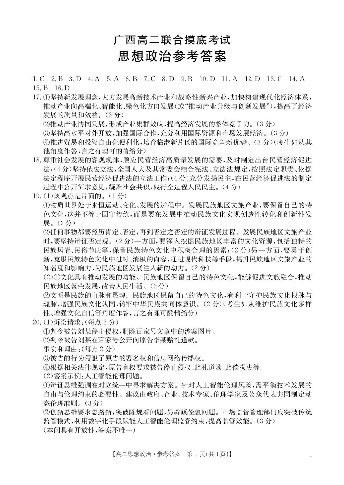 广西部分学校2024-2025学年高二下学期6月联合摸底考试政治答案