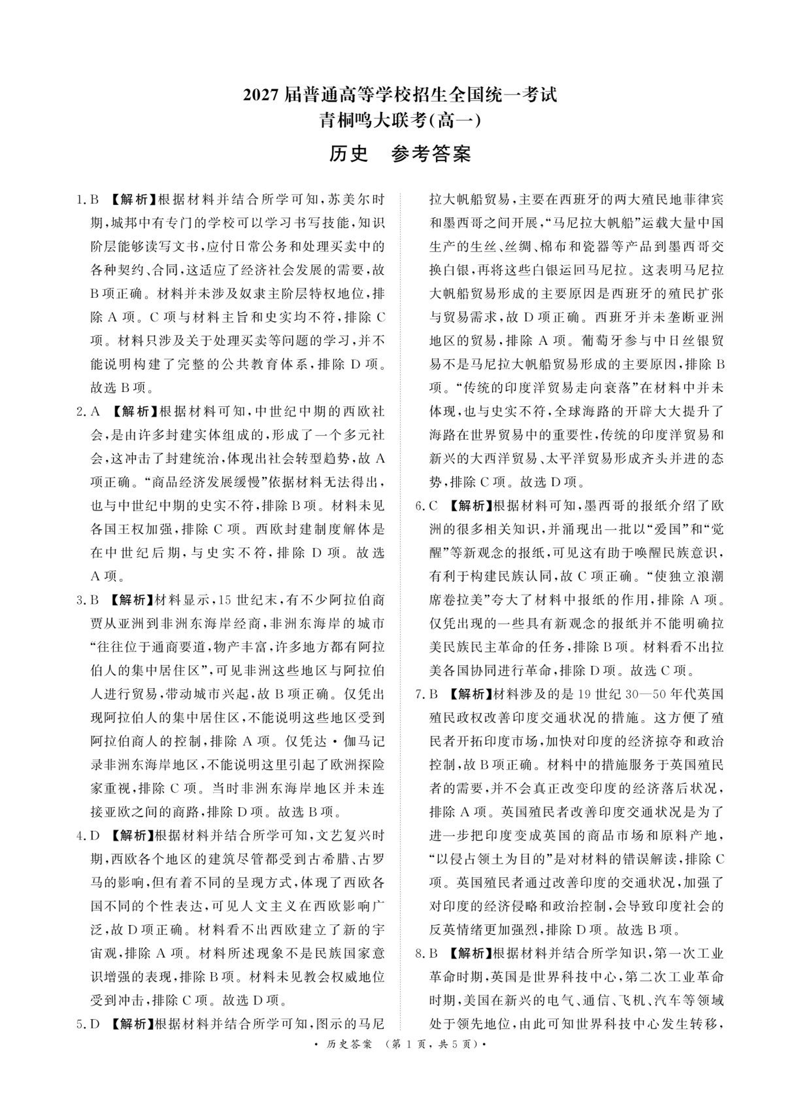 河南省青桐鸣大联考2025年6月高一下学期月考历史答案