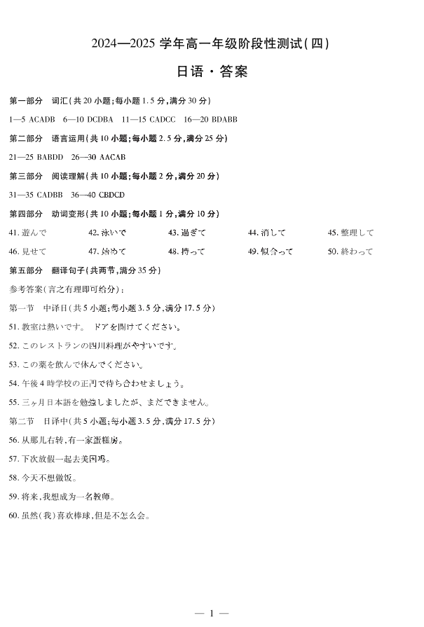 河南省部分学校2024-2025学年高一下学期阶段性测试(四)日语答案