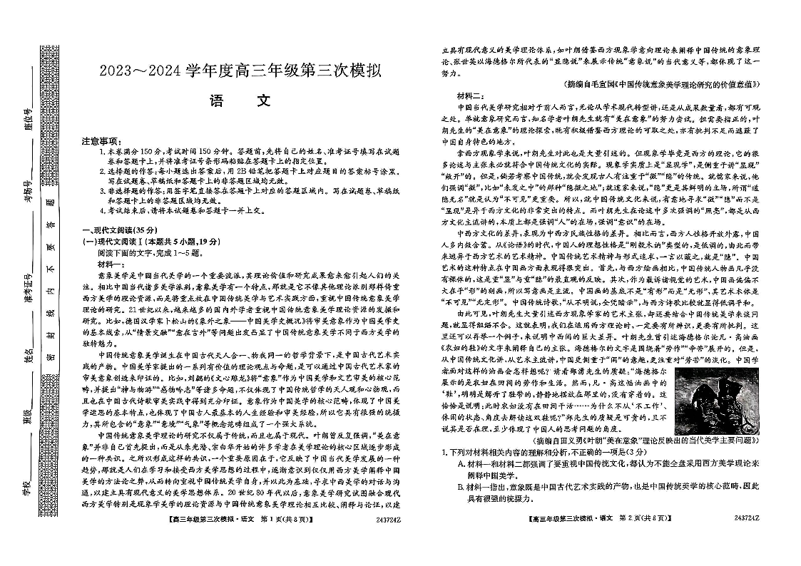 黑龙江省部分学校2024届高三下学期第三次模拟语文