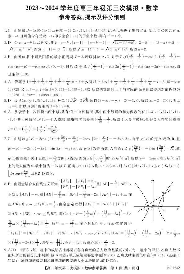 黑龙江省部分学校2024届高三下学期第三次模拟数学答案