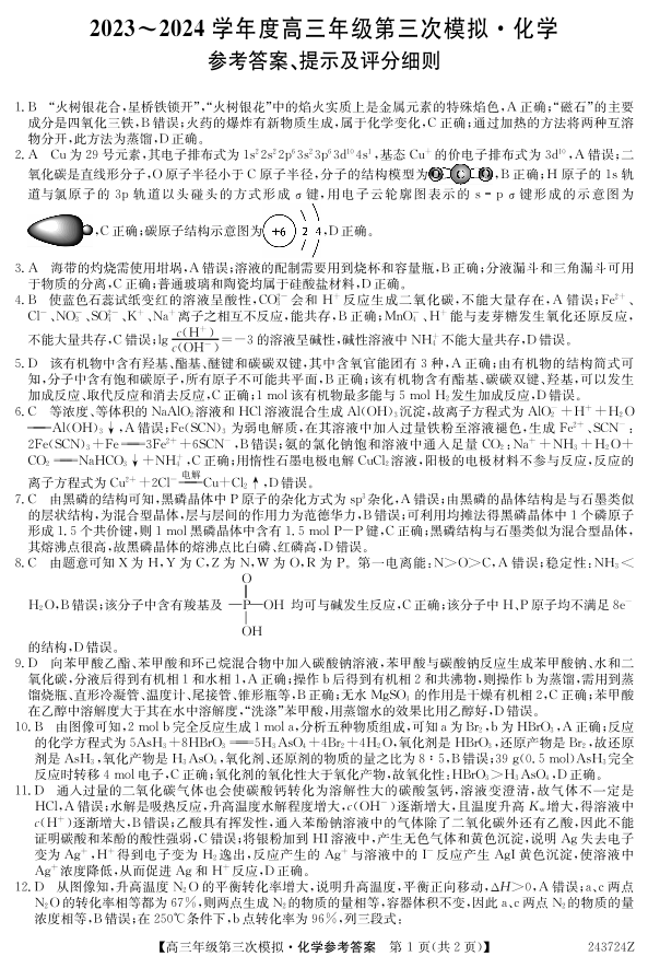 黑龙江省部分学校2024届高三下学期第三次模拟化学答案