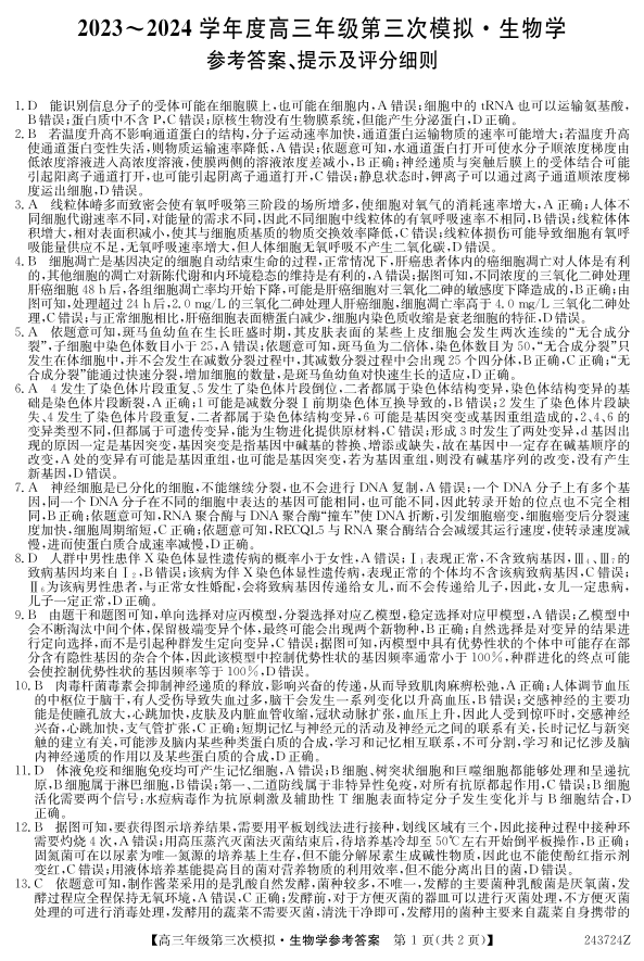 黑龙江省部分学校2024届高三下学期第三次模拟生物答案