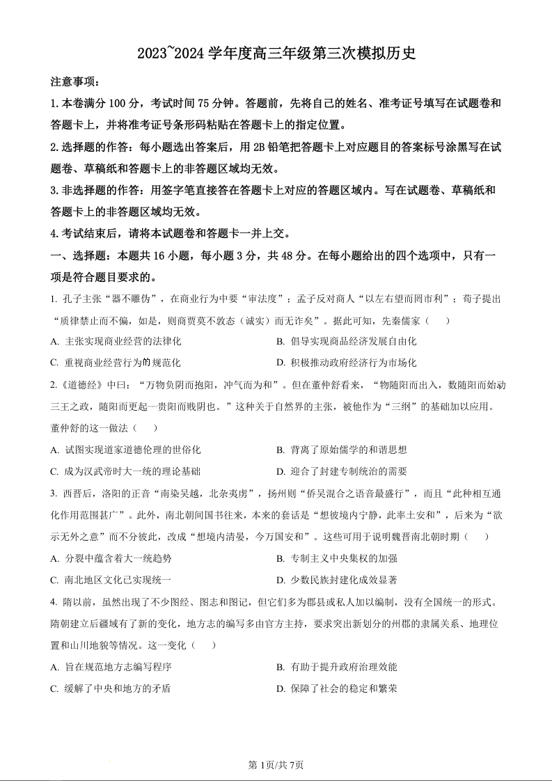 黑龙江省部分学校2024届高三下学期第三次模拟历史(原卷版)
