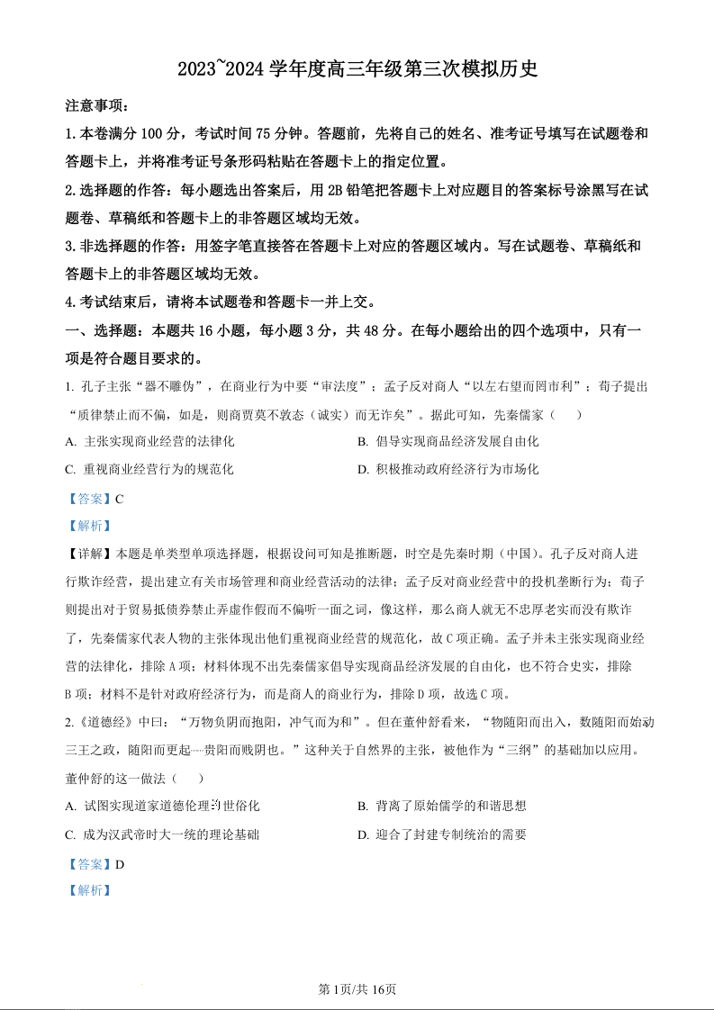 黑龙江省部分学校2024届高三下学期第三次模拟历史(精品解析版)