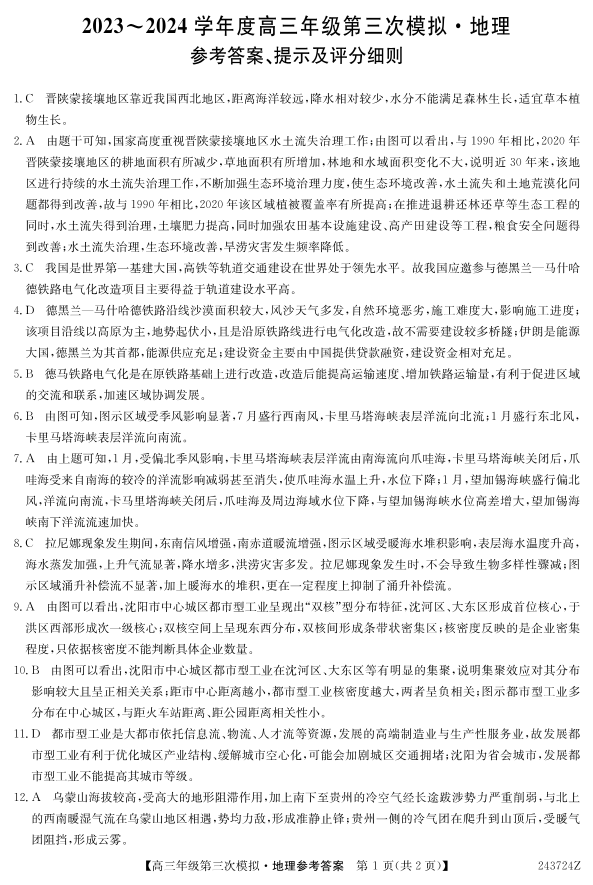 黑龙江省部分学校2024届高三下学期第三次模拟地理答案