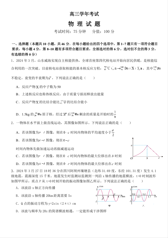 黑龙江省牡丹江市普通高中协同发展共同体2024届高三下学期第一次模拟考试物理+答案
