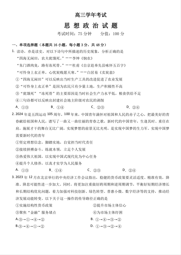 黑龙江省牡丹江市普通高中协同发展共同体2024届高三下学期第一次模拟考试政治+答案