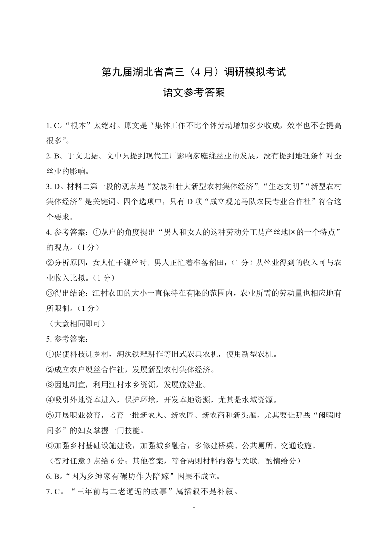 湖北省第九届2024届高三下学期4月调研模拟考试语文答案
