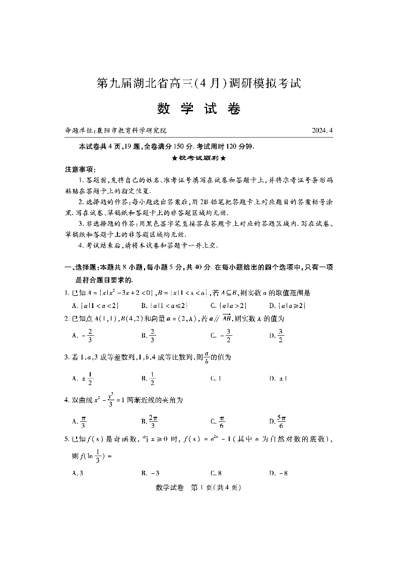 湖北省第九届2024届高三下学期4月调研模拟考试数学