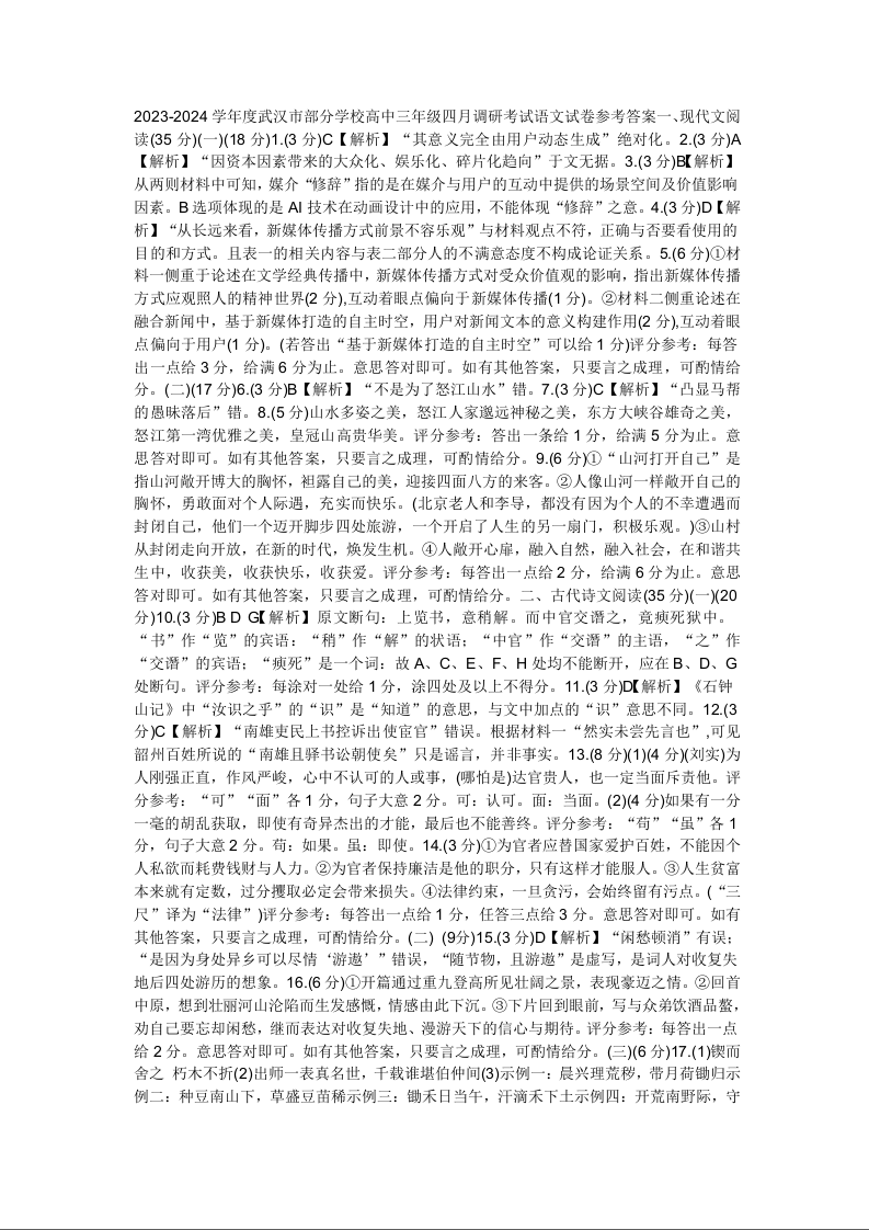 湖北省武汉市2024届高中毕业生四月调研考试语文答案