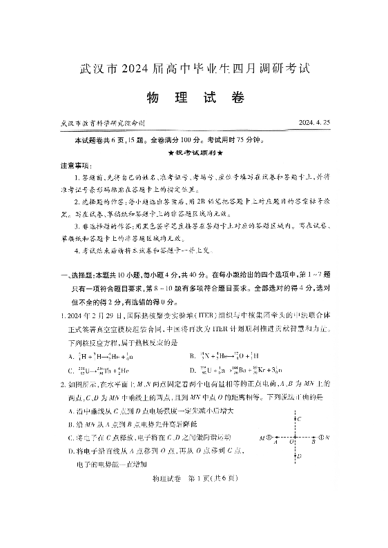 湖北省武汉市2024届高中毕业生四月调研考试物理