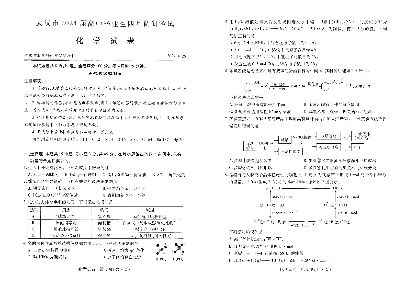 湖北省武汉市2024届高中毕业生四月调研考试化学