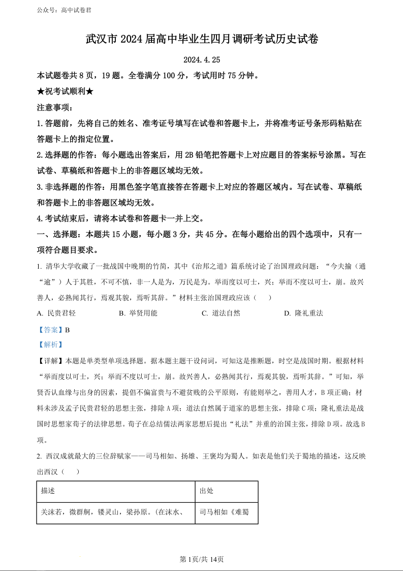 湖北省武汉市2024届高中毕业生四月调研考试历史(精品解析版)