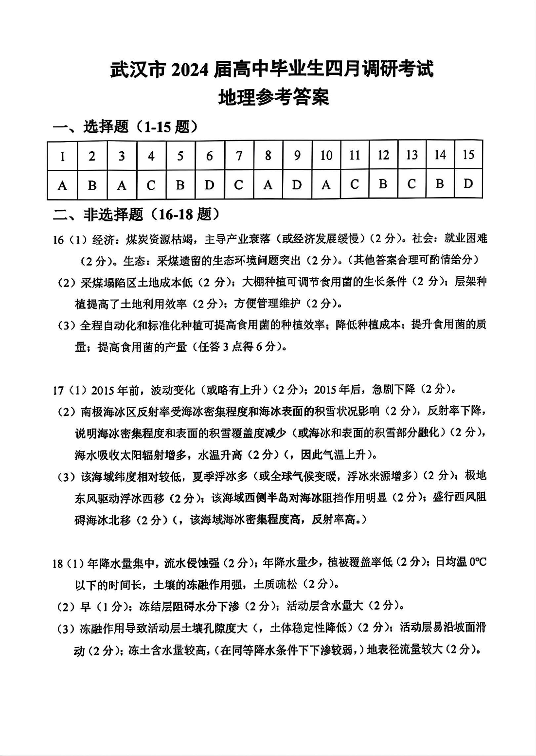 湖北省武汉市2024届高中毕业生四月调研考试地理答案