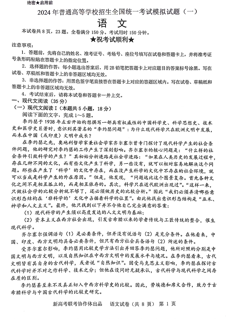 湖北省新高考协作体2024届高三下学期一模考试语文+答案