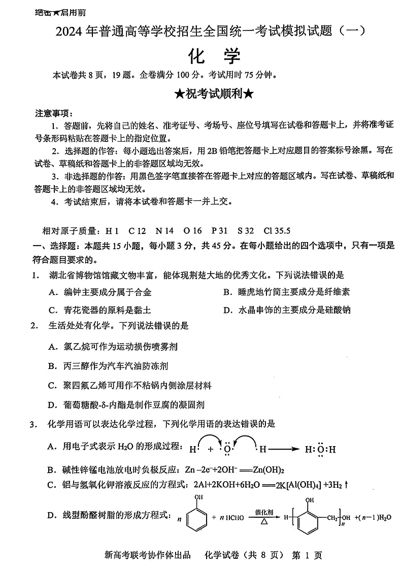 湖北省新高考协作体2024届高三下学期一模考试化学