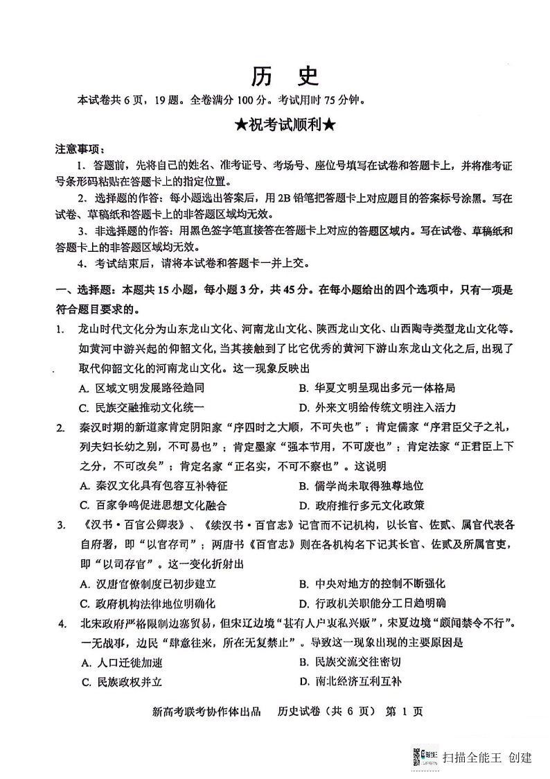 2024届湖北省新高考协作体高三下学期一模考试历史+答案