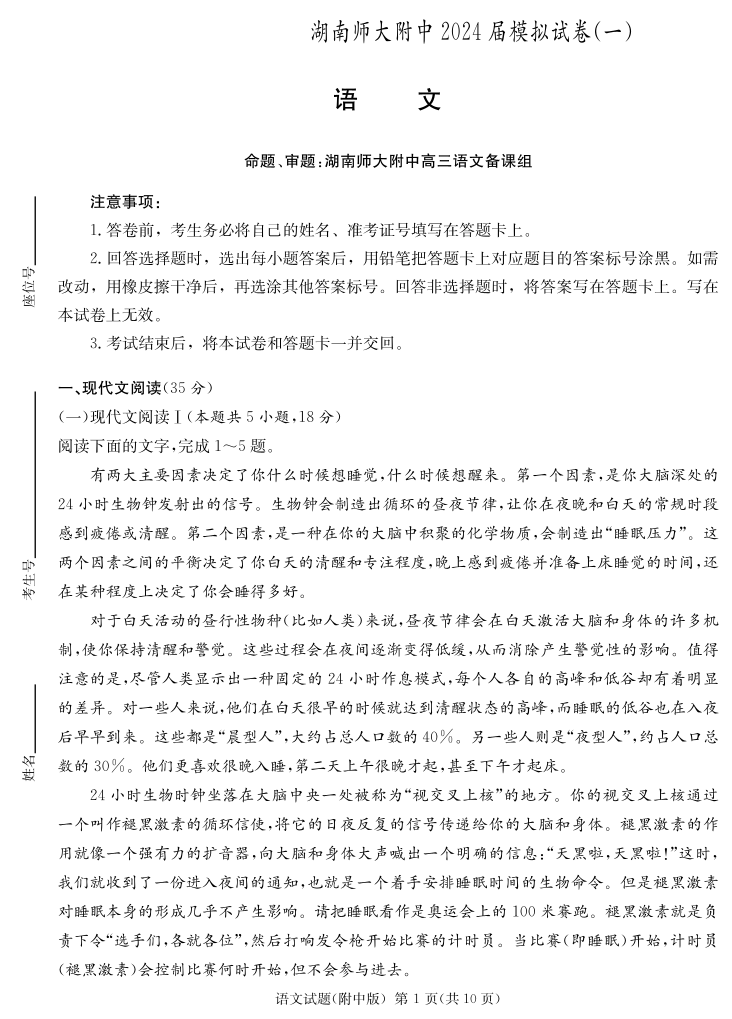 湖南省师范大学附属中学2024届高三下学期模拟考试(一)语文