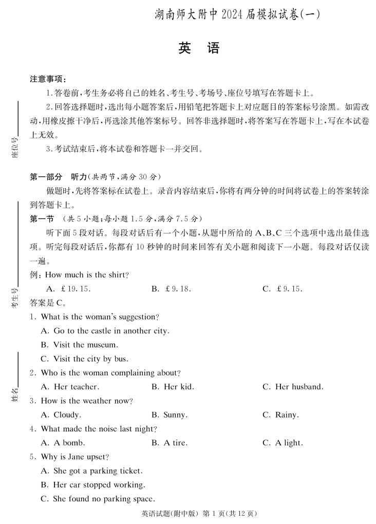 湖南省师范大学附属中学2024届高三下学期模拟考试(一)英语