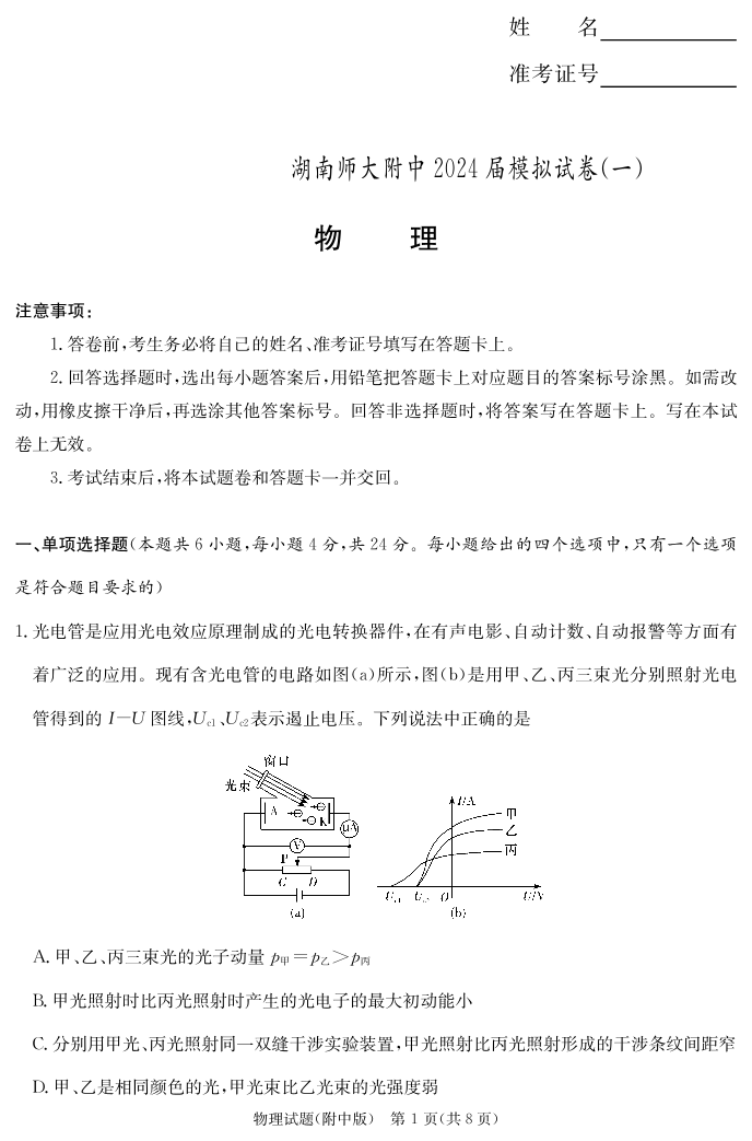 湖南省师范大学附属中学2024届高三下学期模拟考试(一)物理