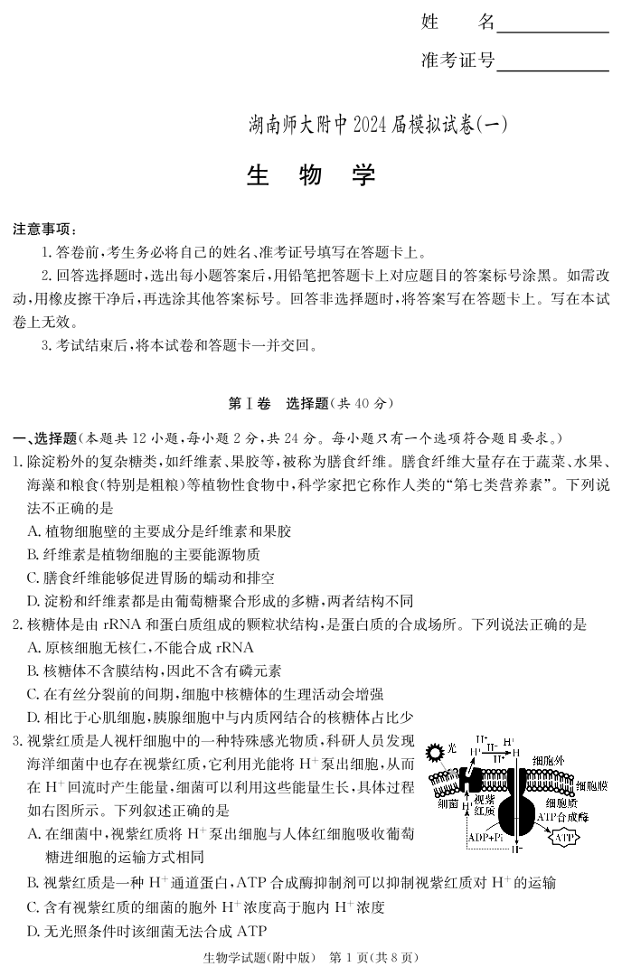 湖南省师范大学附属中学2024届高三下学期模拟考试(一)生物