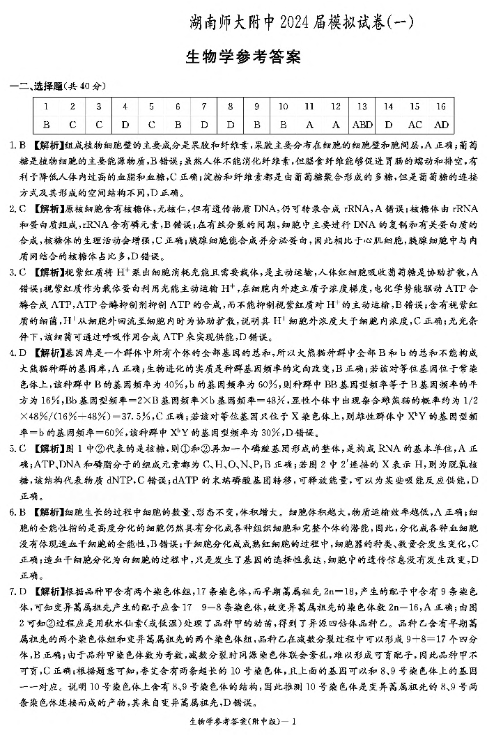湖南省师范大学附属中学2024届高三下学期模拟考试(一)生物答案