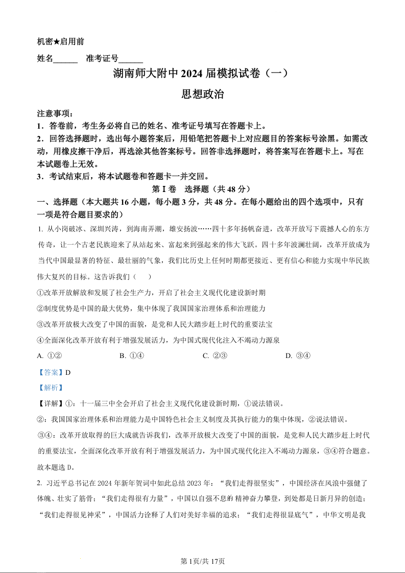 湖南省师范大学附属中学2024届高三下学期模拟考试(一)政治(精品解析版)