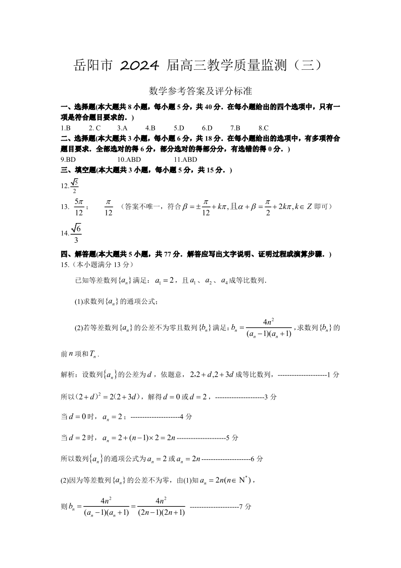 湖南省岳阳市2024届高三教学质量监测(三)(岳阳三模)数学答案