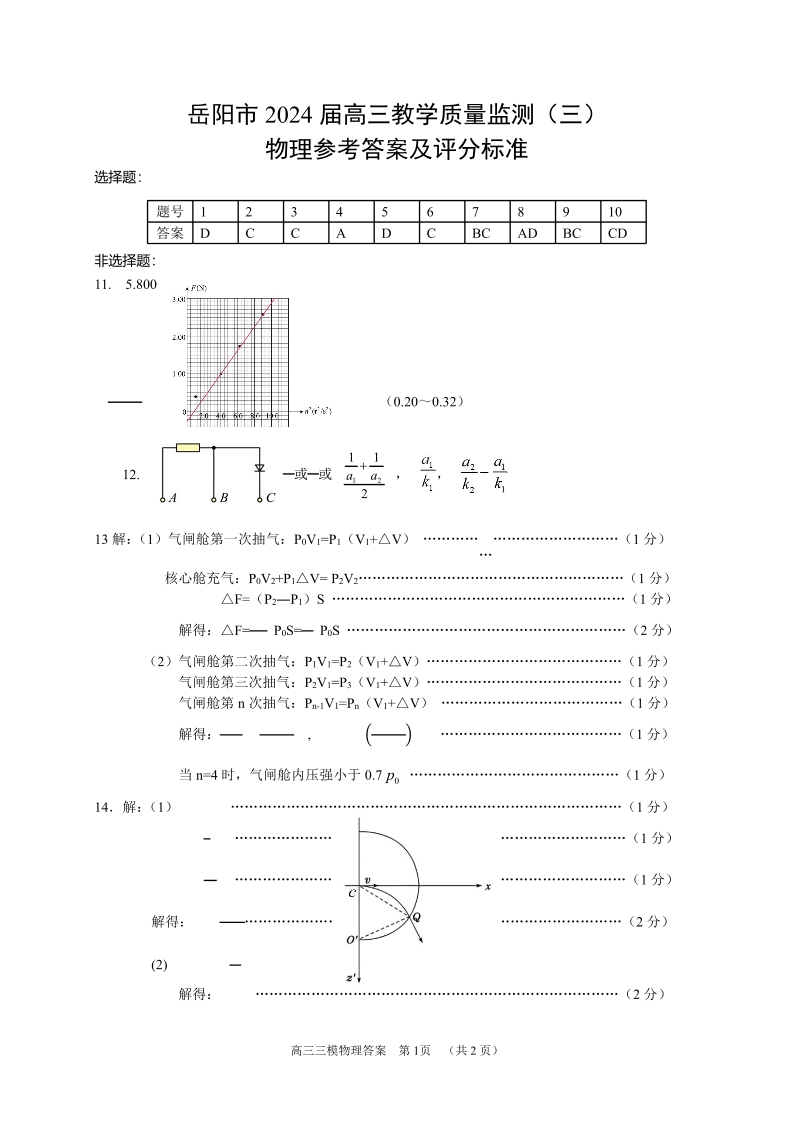 湖南省岳阳市2024届高三教学质量监测(三)(岳阳三模)物理答案