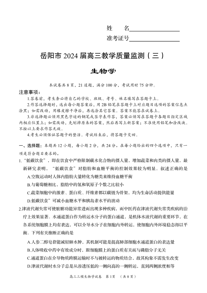 湖南省岳阳市2024届高三教学质量监测(三)(岳阳三模)生物