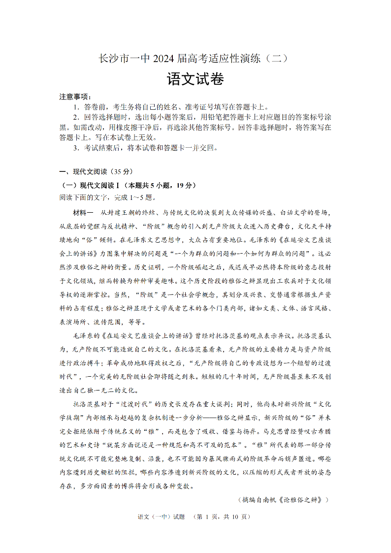 湖南省长沙市第一中学2024届高考适应性演练(二)语文