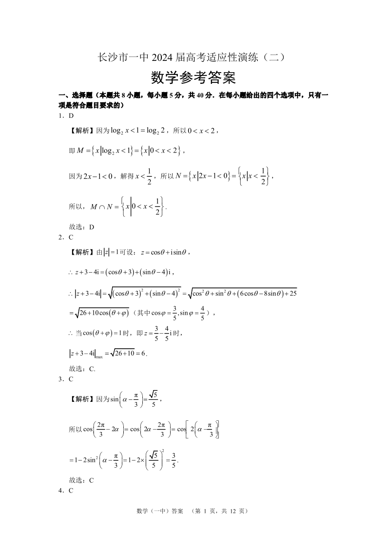 湖南省长沙市第一中学2024届高考适应性演练(二)数学答案