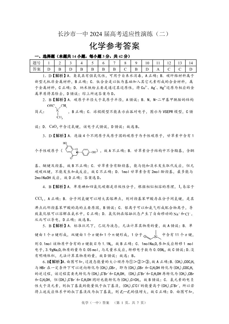 湖南省长沙市第一中学2024届高考适应性演练(二)化学答案