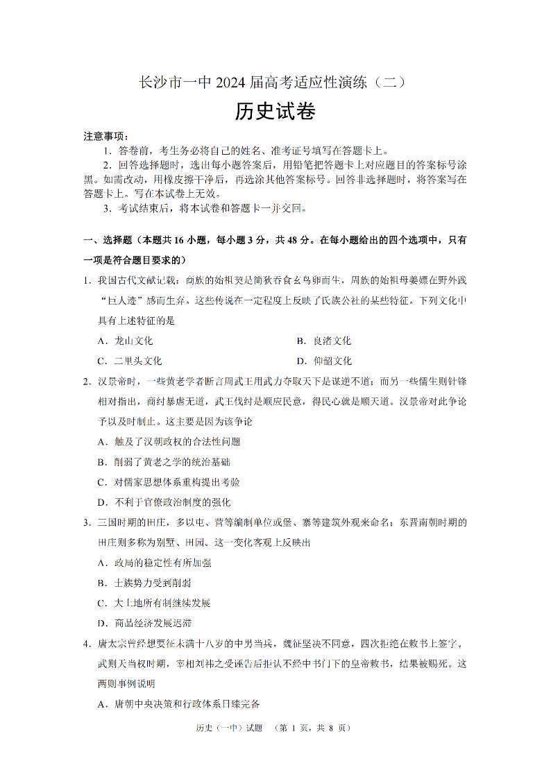 湖南省长沙市第一中学2024届高考适应性演练(二)历史