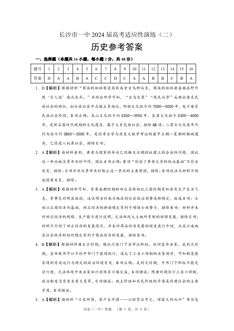 湖南省长沙市第一中学2024届高考适应性演练(二)历史答案