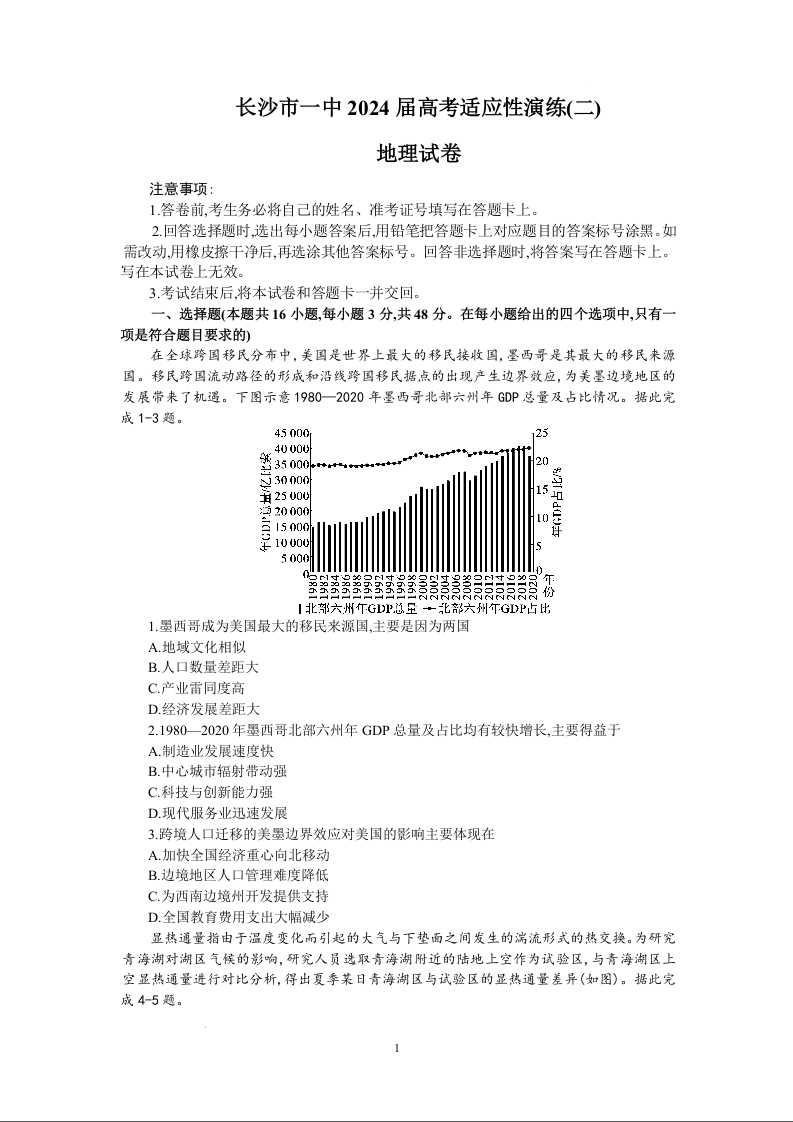 湖南省长沙市第一中学2024届高考适应性演练(二)地理