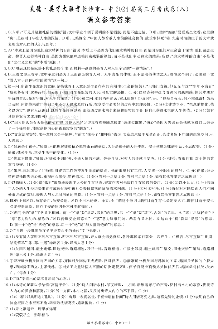 湖南省长沙市第一中学2024届高三下学期月考(八)语文答案
