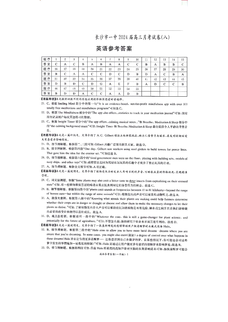 湖南省长沙市第一中学2024届高三下学期月考(八)英语答案