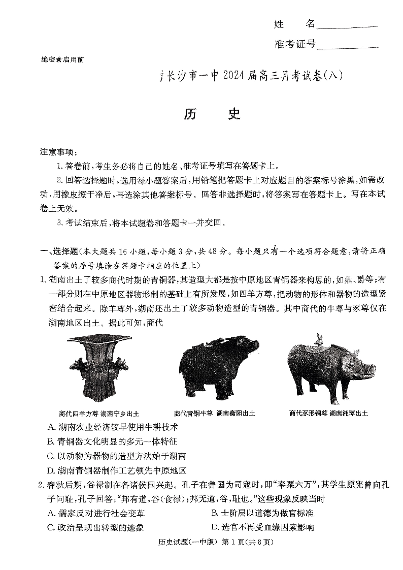 湖南省长沙市第一中学2024届高三下学期月考(八)历史