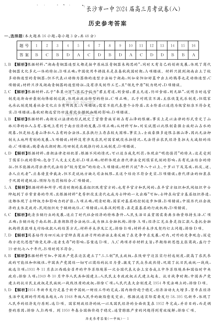 湖南省长沙市第一中学2024届高三下学期月考(八)历史答案